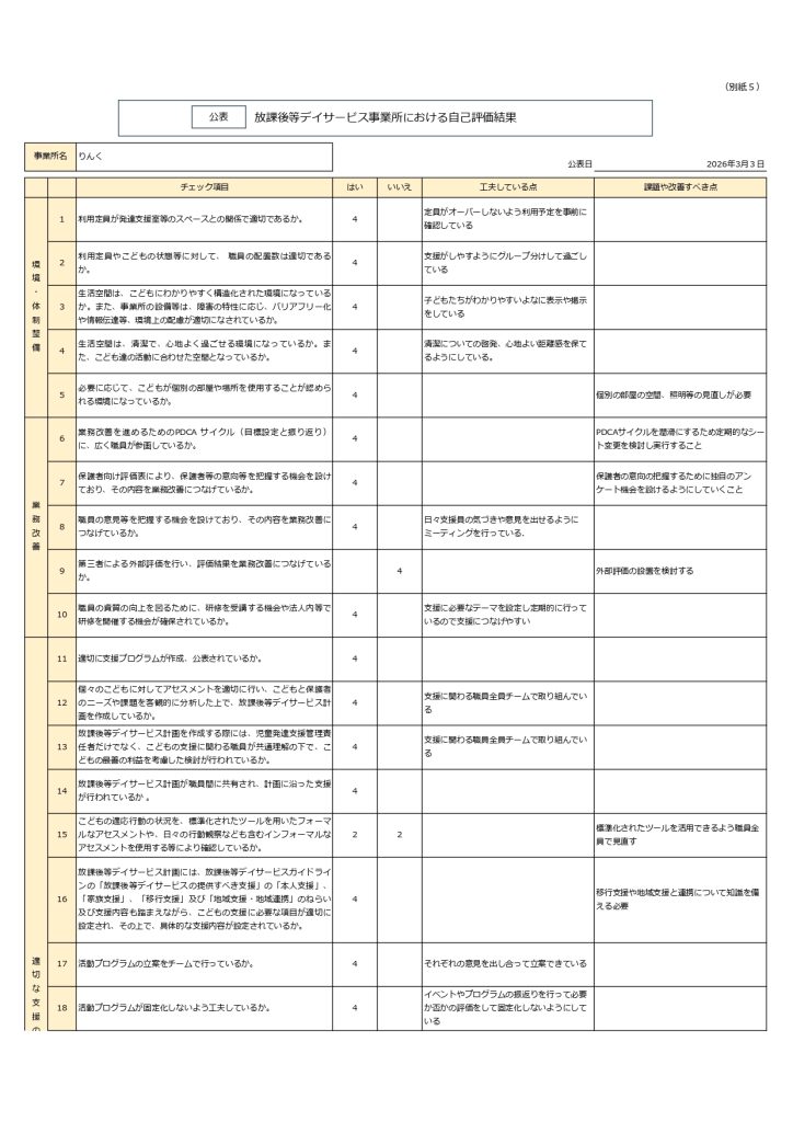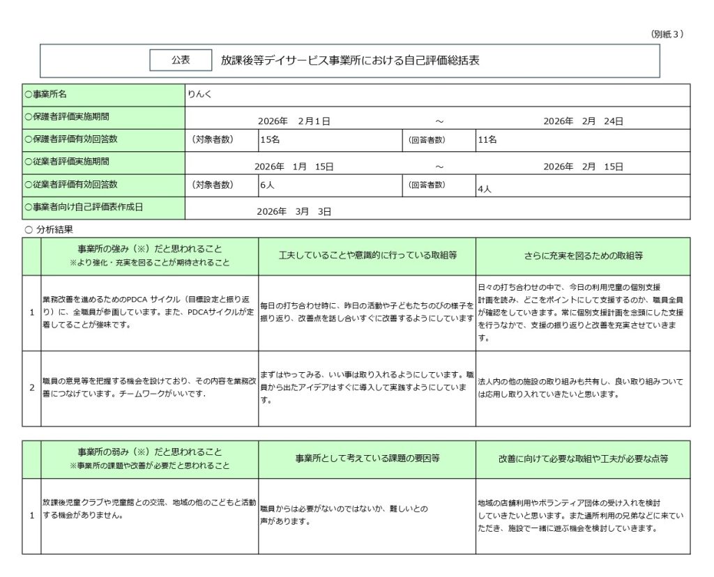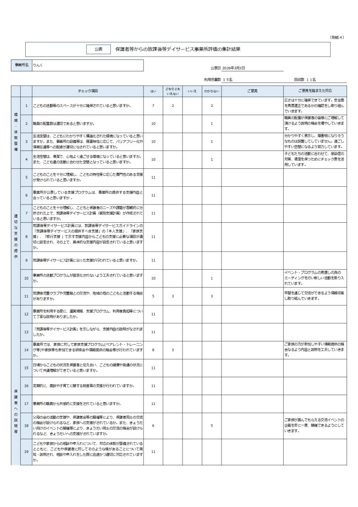 放課後等デイサービスガイドラインに基づき、令和7年度事業所評価のその集計結果について公表いたします。